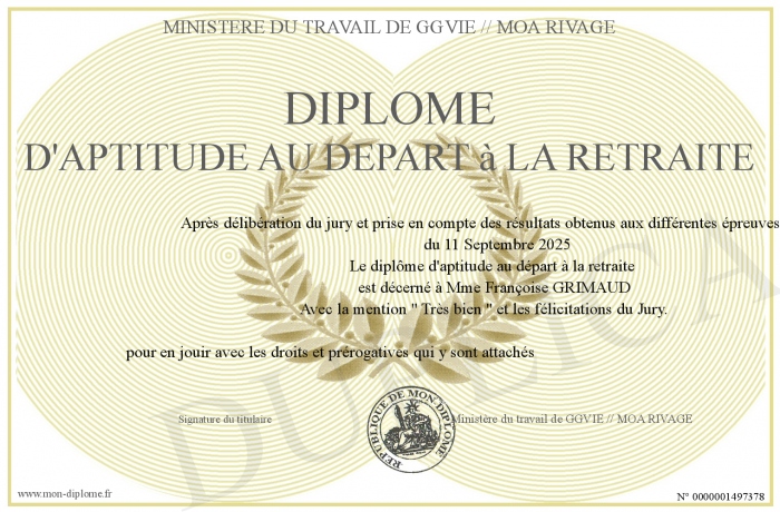 Envoyez par email votre Diplôme D'APTITUDE AU DEPART à LA RETRAITE personalisé