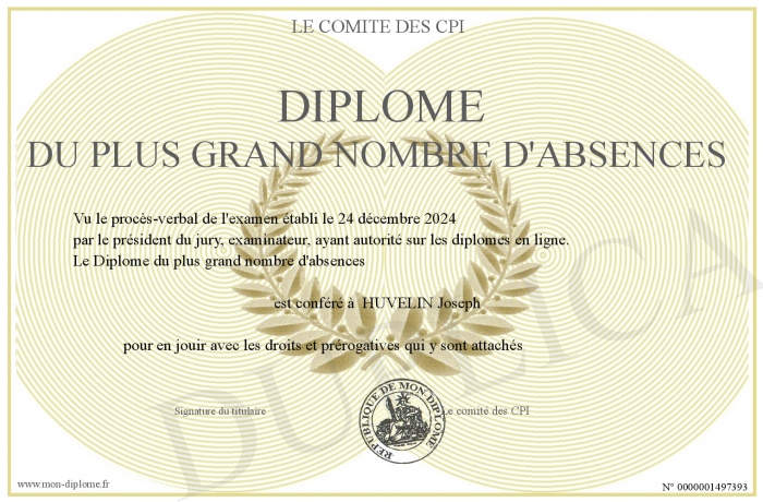 Envoyez par email votre Diplôme du plus grand nombre d'absences personalisé