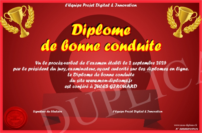 Envoyez par email votre Diplome de bonne conduite personalisé