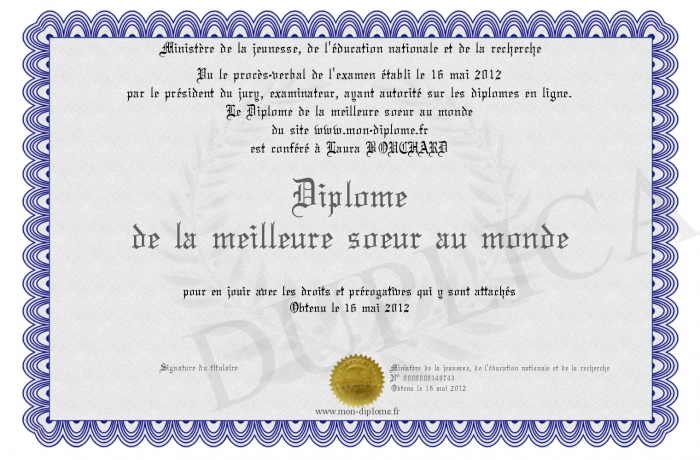 Envoyez par email votre Diplôme de la meilleure soeur au monde personalisé
