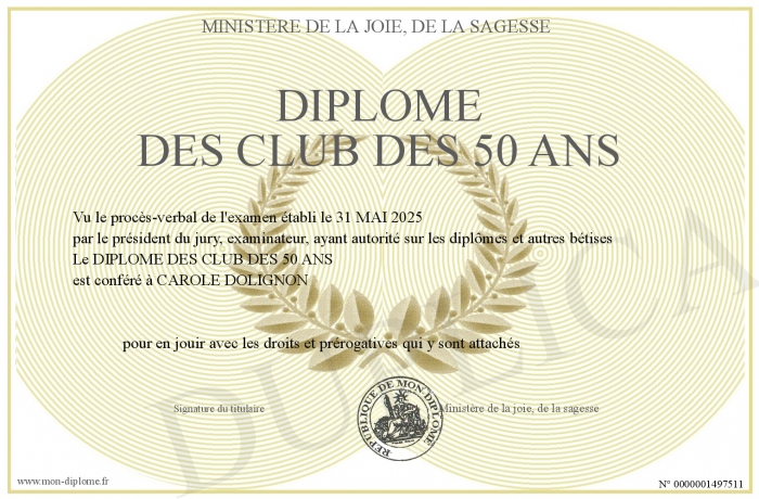 Envoyez par email votre DIPLOME DES CLUB DES 50 ANS personalisé