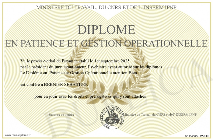 Envoyez par email votre Diplôme en Patience et Gestion Opérationnelle personalisé
