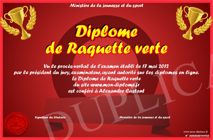 Envoyez par email votre Diplôme de Raquette verte personalisé