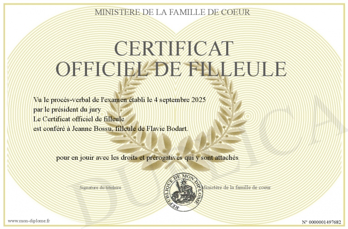 Envoyez par email votre Certificat officiel de filleule personalisé