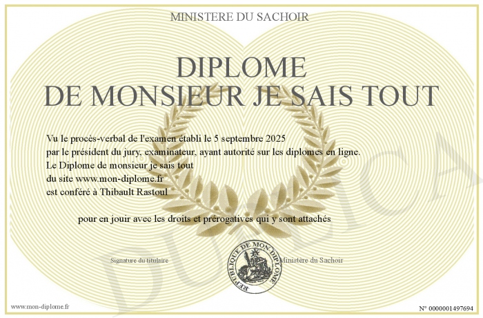 Envoyez par email votre Diplôme de monsieur je sais tout personalisé