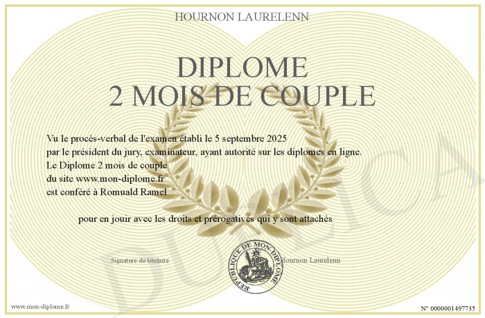 Envoyez par email votre Diplôme 2 mois de couple personalisé