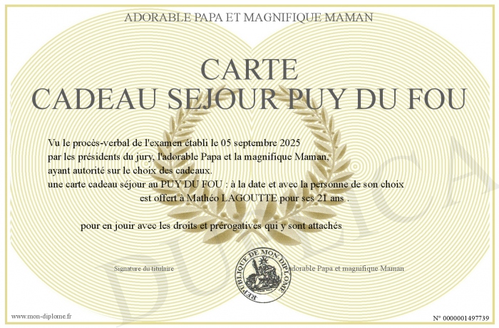 Envoyez par email votre Carte cadeau séjour PUY DU FOU personalisé