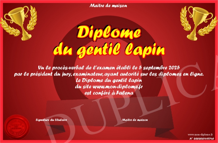 Envoyez par email votre Diplôme du gentil lapin personalisé