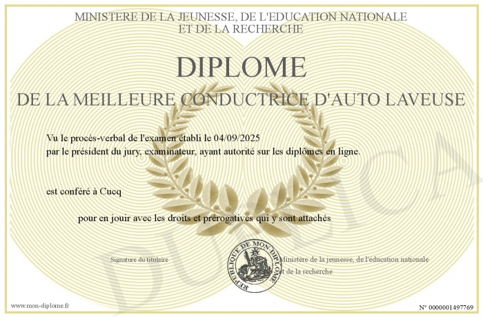 Envoyez par email votre Diplôme de la meilleure conductrice d'auto laveuse personalisé