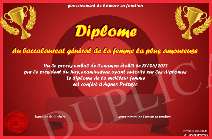 Envoyez par email votre Diplôme du baccalaureat général de la femme la plus amoureuse personalisé