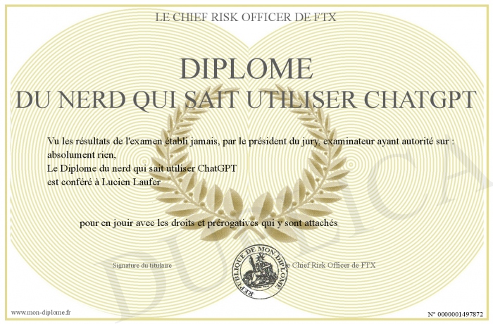 Envoyez par email votre Diplôme du nerd qui sait utiliser ChatGPT personalisé