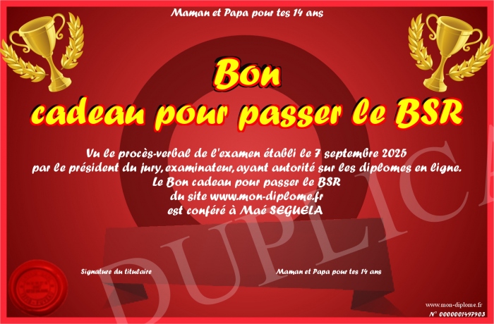 Envoyez par email votre Bon cadeau pour passer le BSR personalisé