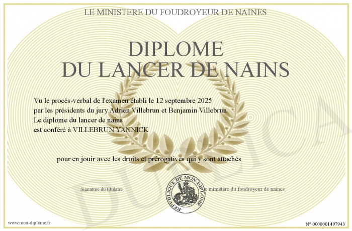 Envoyez par email votre diplome du lancer de nains personalisé