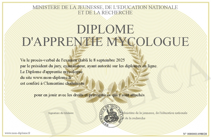 Envoyez par email votre Diplôme d'apprentie mycologue personalisé