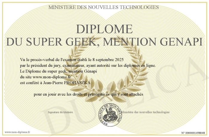 Envoyez par email votre Diplôme du super geek, mention Génapi personalisé