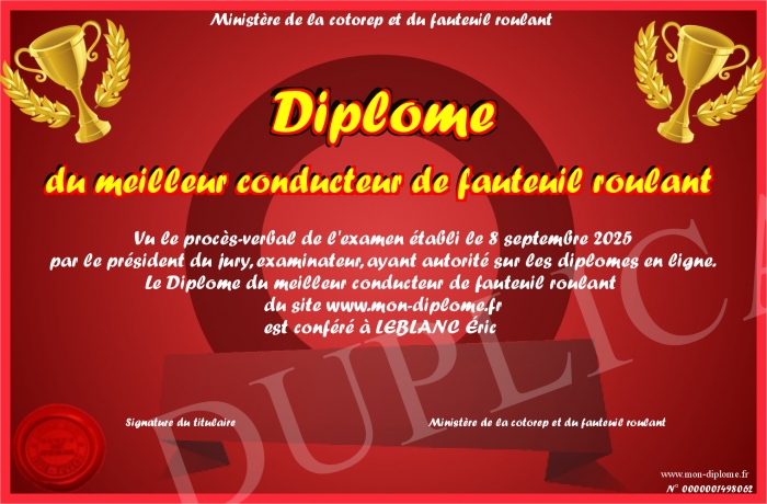Envoyez par email votre Diplôme du meilleur conducteur de fauteuil roulant personalisé