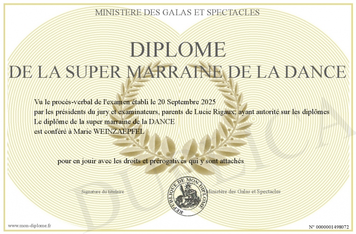 Envoyez par email votre Diplôme de la super Marraine de la DANCE personalisé