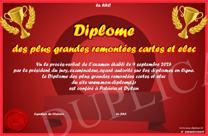 Envoyez par email votre Diplome des plus grandes remontées cartes et elec personalisé