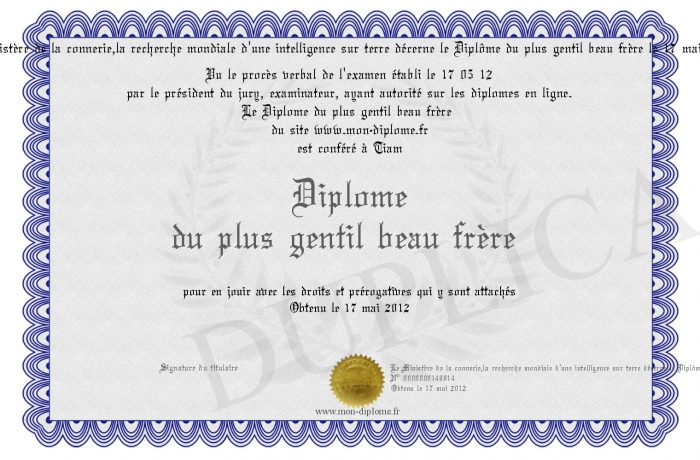 envoyé par le Le Ministère de la connerie,la recherche mondiale d'une intelligence sur terre décerne le Diplôme du plus gentil beau frère le 17 mai 2012. !