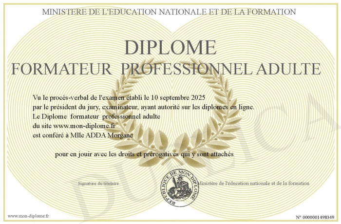 Envoyez par email votre Diplôme formateur professionnel adulte personalisé