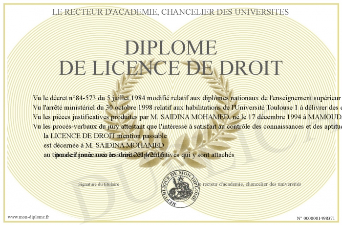 Envoyez par email votre Diplôme de licence de droit personalisé