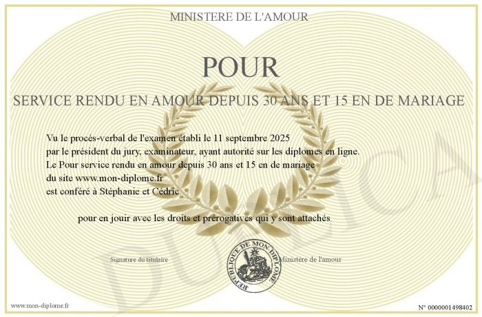 Envoyez par email votre Pour service rendu en amour depuis 30 ans et 15 en de mariage personalisé