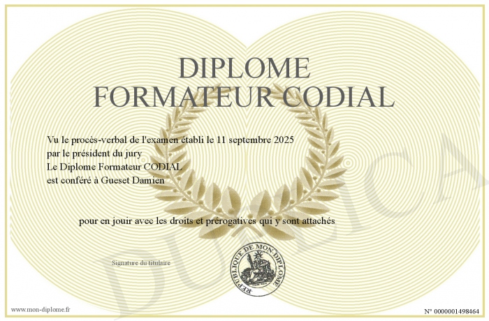 Envoyez par email votre Diplôme Formateur CODIAL personalisé