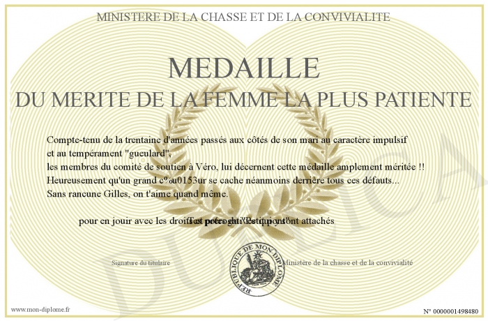 Envoyez par email votre Médaille du mérite de la femme la plus patiente personalisé