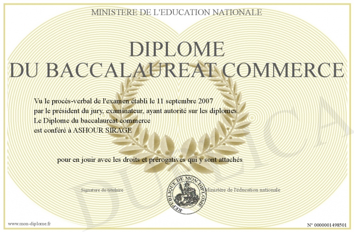 Envoyez par email votre Diplôme du baccalaureat commerce personalisé
