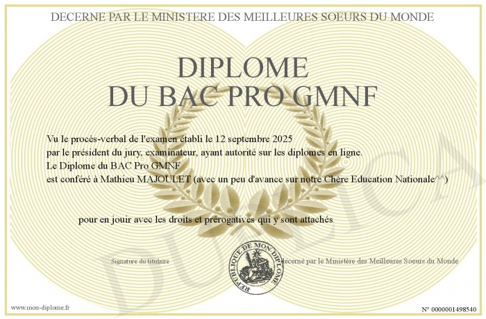 Envoyez par email votre Diplôme du BAC Pro GMNF personalisé