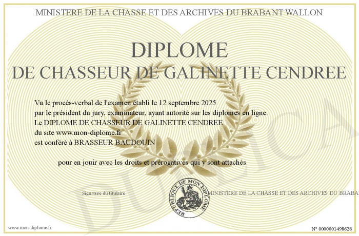 Envoyez par email votre DIPLOME DE CHASSEUR DE GALINETTE CENDREE personalisé
