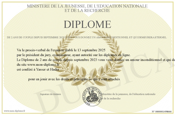 Envoyez par email votre Diplôme de 2 ans de couple depuis septembre 2023 vous vous donnez un amour inconditionnel et qui demeurera éternel. personalisé