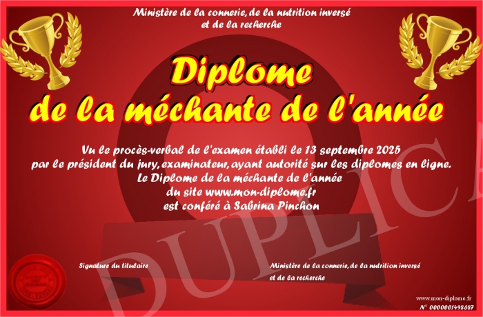 Envoyez par email votre Diplôme de la méchante de l'année personalisé