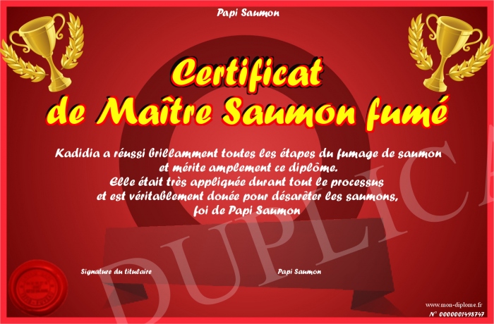 Envoyez par email votre Certificat de Maître Saumon fumé personalisé