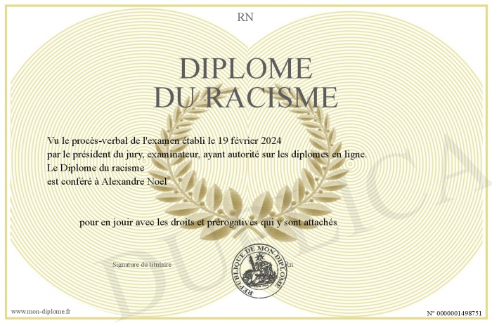 Envoyez par email votre Diplôme du racisme personalisé