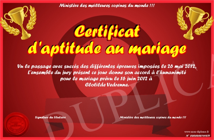 Envoyez par email votre Certificat d'aptitude au mariage personalisé