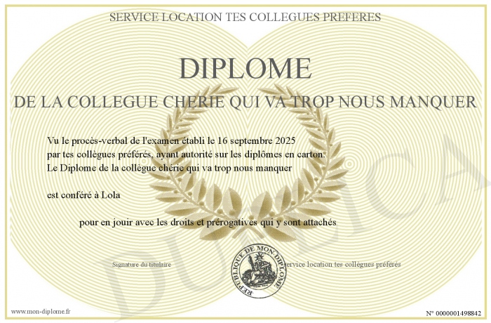 Envoyez par email votre Diplôme de la collègue chérie qui va trop nous manquer personalisé