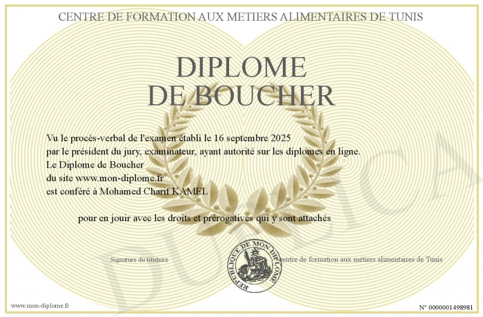 Envoyez par email votre Diplôme de Boucher personalisé