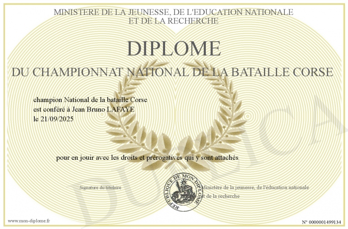 Envoyez par email votre Diplôme du championnat national de la bataille Corse personalisé