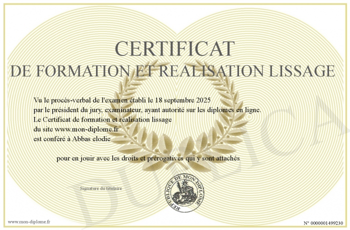 Envoyez par email votre Certificat de formation et réalisation lissage personalisé