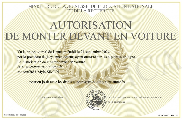 Envoyez par email votre Autorisation de monter devant en voiture personalisé