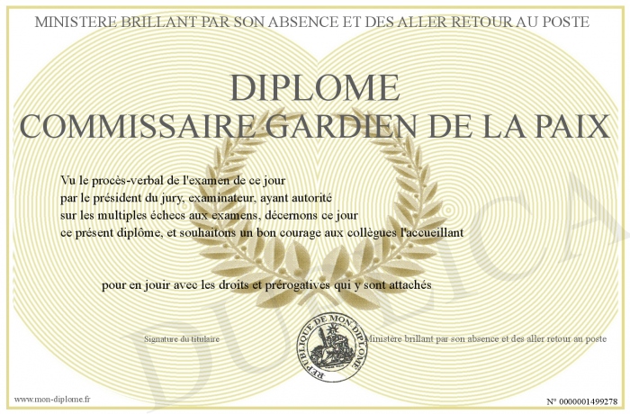 Envoyez par email votre Diplôme Commissaire Gardien de la Paix personalisé