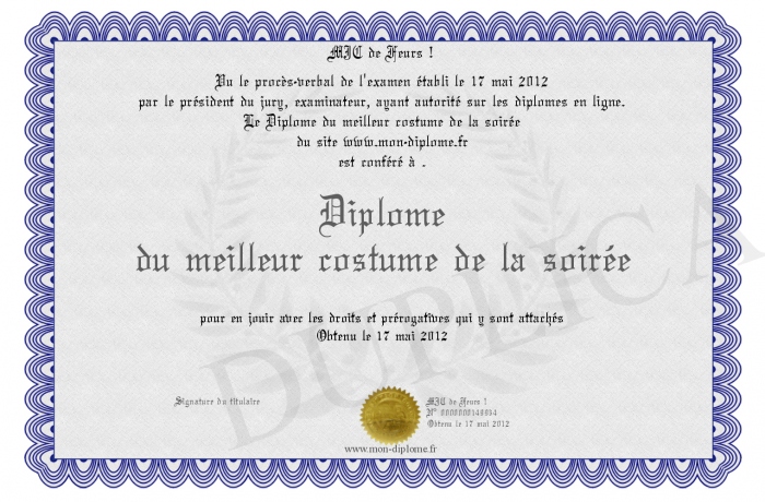 Envoyez par email votre Diplôme du meilleur costume de la soirée personalisé