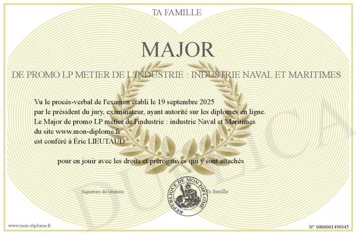 Envoyez par email votre Major de promo LP métier de l'industrie : industrie Naval et Maritimes personalisé