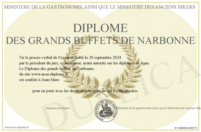 Envoyez par email votre Diplôme des grands buffets de Narbonne personalisé