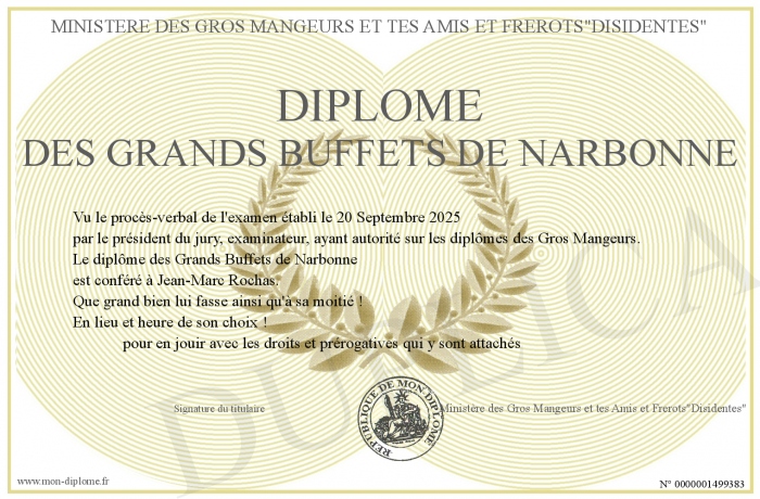 Envoyez par email votre Diplôme des Grands Buffets de Narbonne personalisé