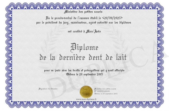 Envoyez par email votre Diplôme de la dernière dent de lait personalisé