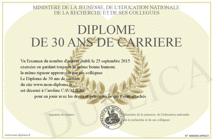 Envoyez par email votre Diplôme de 30 ans de carrière personalisé