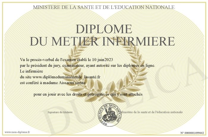 Envoyez par email votre Diplôme du métier infirmière personalisé