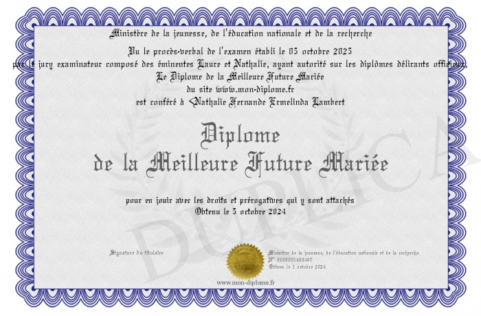 Envoyez par email votre Diplôme de la Meilleure Future Mariée personalisé